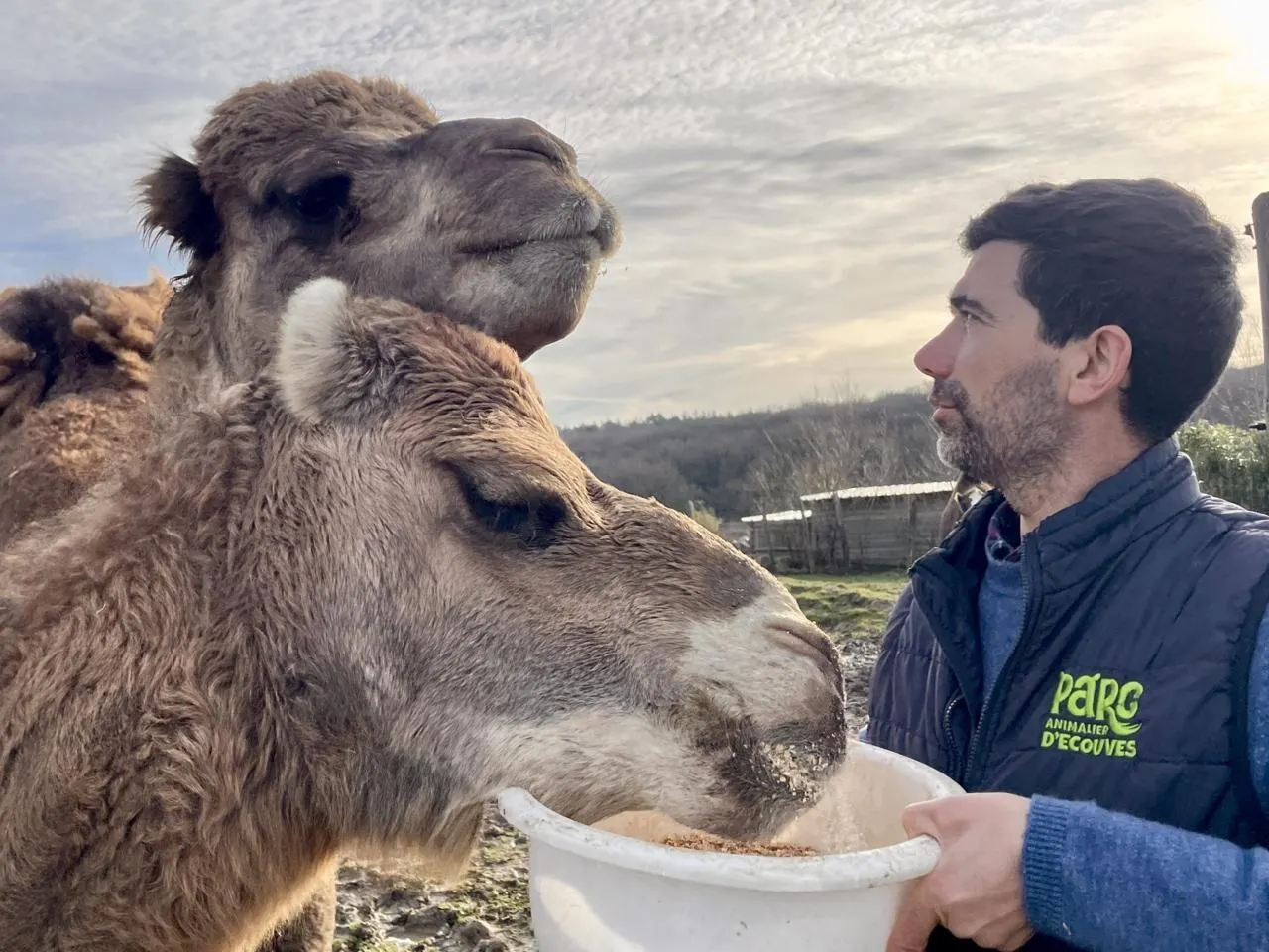 Vincent Chauvin, directeur du parc animalier d’Écouves, avec deux des dromadaires de la structure. © Ouest-France