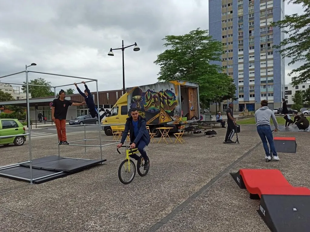 Au bout d’une petite d’heure de mise en place, certains commencent à se lancer des défis : « tu paries que je passe l’obstacle en trottinette ? », « allez tente un salto », pendant que d’autres enfourchent en rigolant un vélo désarticulé, sorte d’engin entre le deux-roues et le monocycle.