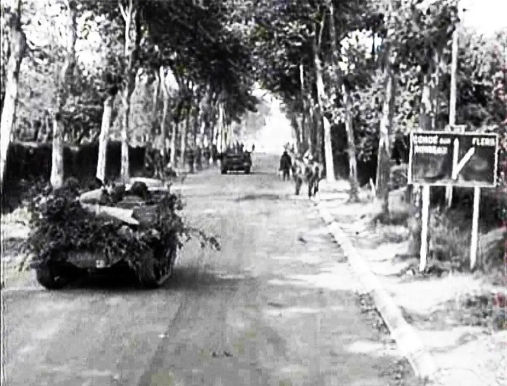 Le 16 août 1944, deux Bren-Carrier (chenillette d’infanterie) de la 3e Division d’infanterie, camouflés avec du feuillage, se dirigent vers le carrefour de la Madeleine, à la sortie de Tinchebray (Orne). © Archives américaines (Nara)