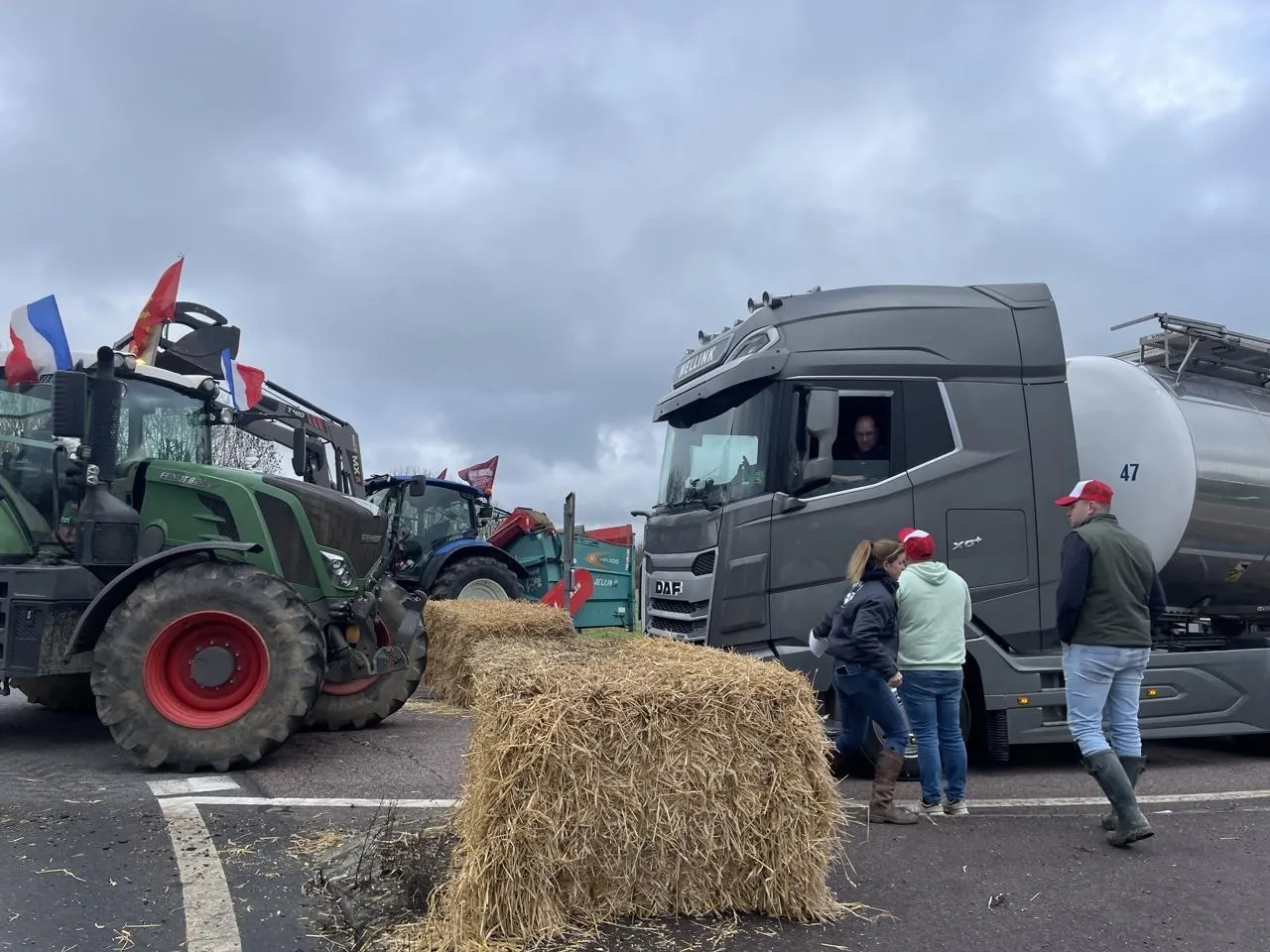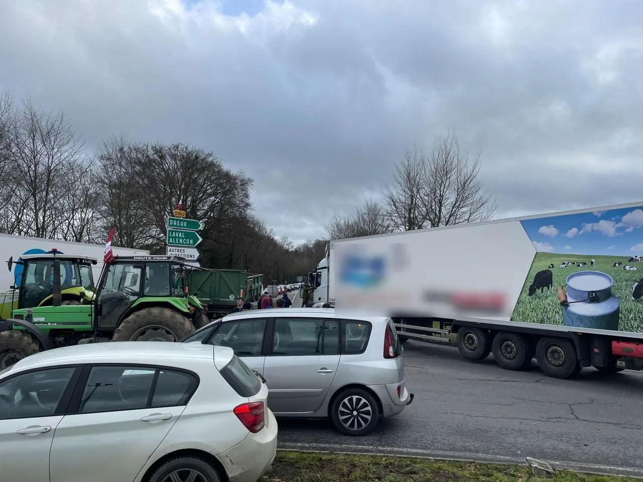 Les Jeunes Agriculteurs de l’Orne bloquent ce camion-citerne remplit de lait hollandais qui sort de la RN 12. © Ouest-France