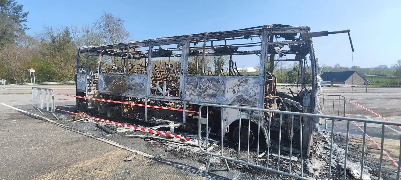 Un bus a été entièrement détruit par les flammes, dans la nuit du 20 au 21 mars 2026, à Carrouges. © Ouest-France