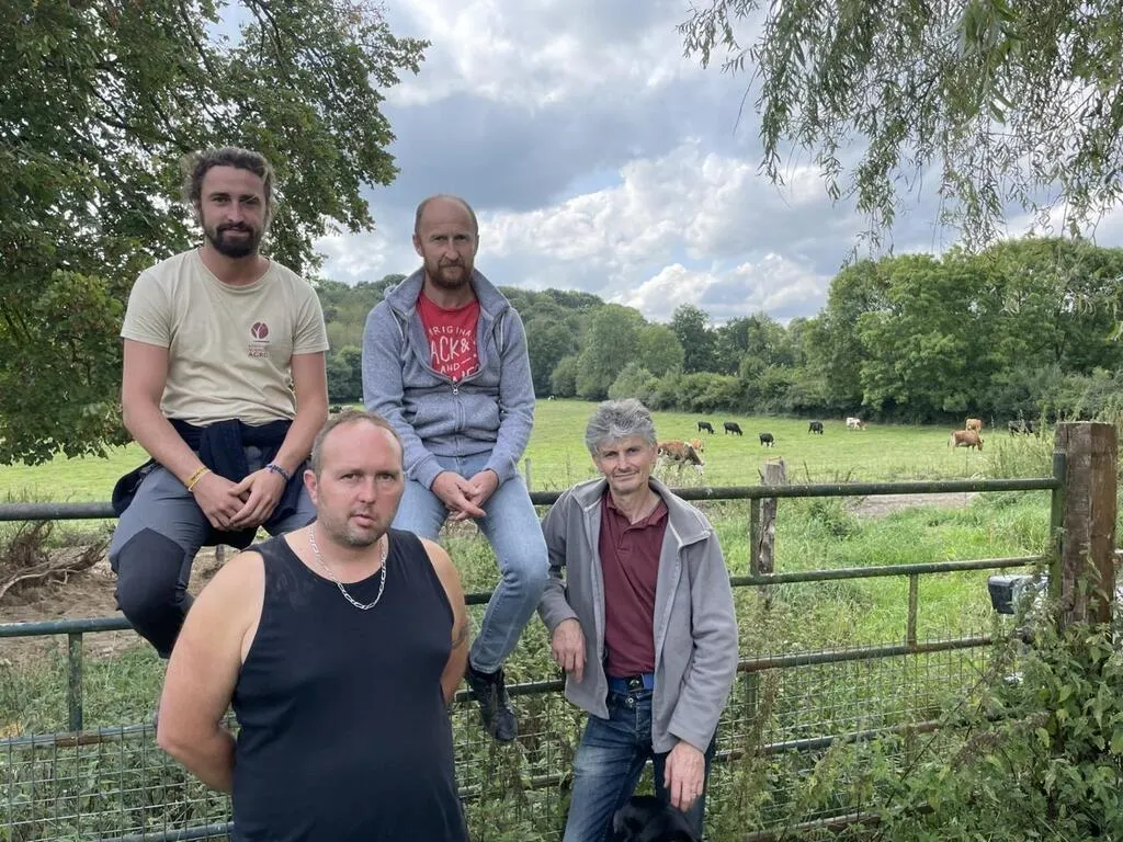 Thomas Perzo, à gauche sur la barrière, animateur du Civam normand, accompagnent des agriculteurs de l’Orne dans la pratique du stock sur pied. Christophe Davy, David Hamelin et Anthony Gilmas ont expérimenté la technique. © Ouest-France