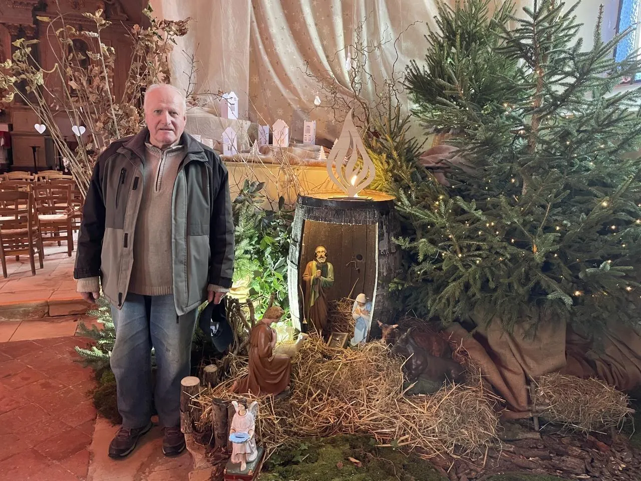 Xavier, l’un des bénévoles qui veillent sur les deux églises de Putanges-le-Lac, est venu voir si la crèche de Saint-Ouen était en ordre avant l’inauguration du samedi 13 décembre. © Ouest-France