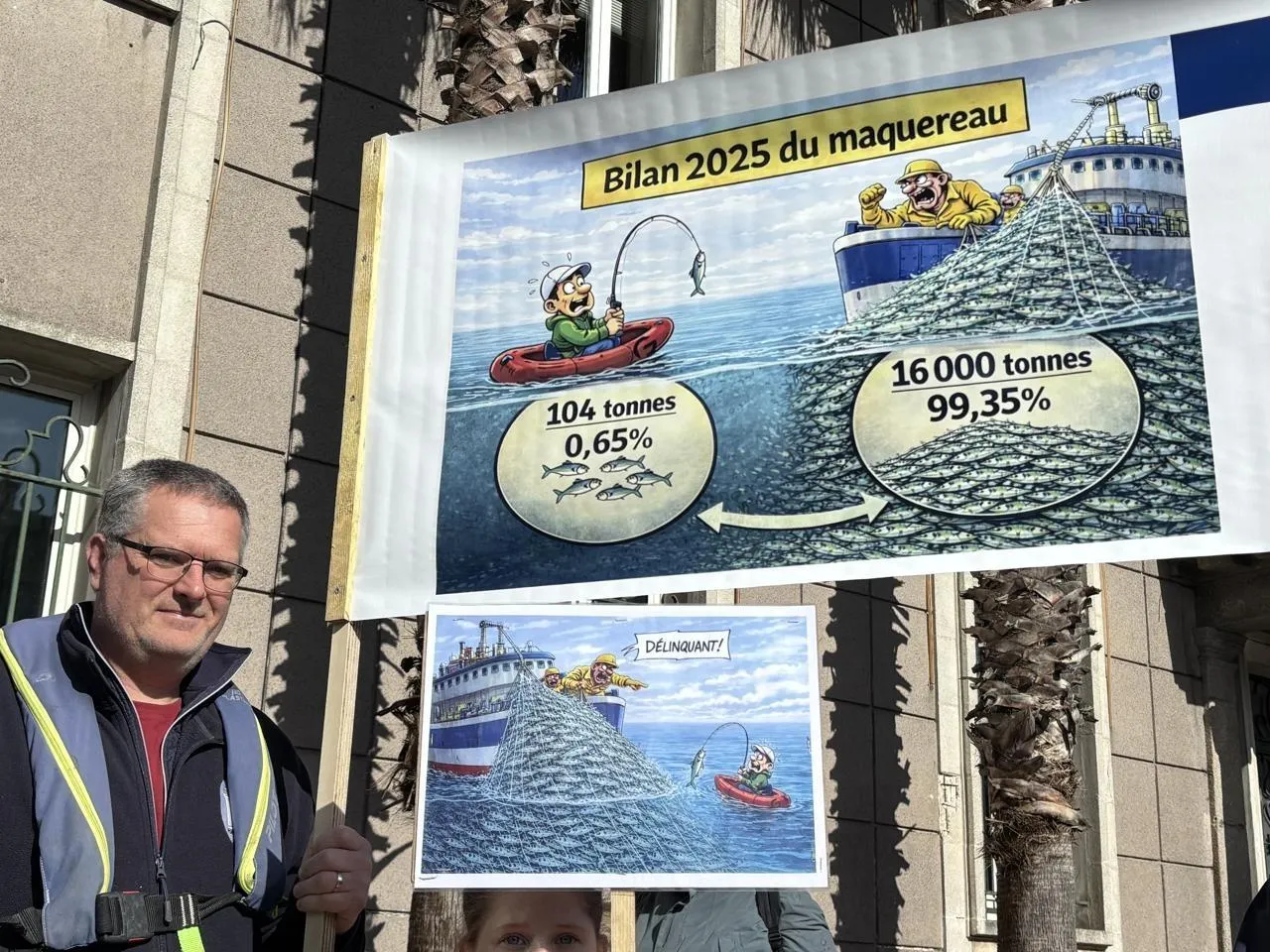 Une banderole humoristique dessine le contraste : 104 tonnes de maquereaux prélevées en 2025 par les pêcheurs amateurs. 16 000 tonnes par les fabricants de farine de poisson.