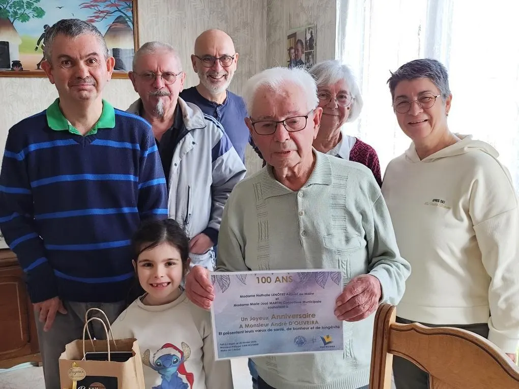 André d’Oliveira a fêté ses 100 ans à L’Aigle (Orne), vendredi 20 février 2026, en présence de Nathalie Lenôtre, adjointe au maire, accompagnée de Marie-José Martin, conseillère municipale, avec ses enfants et sa famille.
