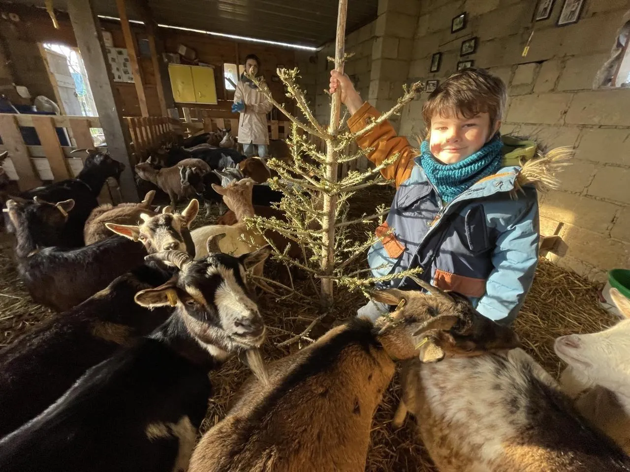 Aimé Cerveira, 5 ans et demi, tient le sapin de Noël que les chèvres naines de la ferme des Terres Fleuries, à Heugon, ne vont pas tarder à finir de dévorer. © Ouest-France