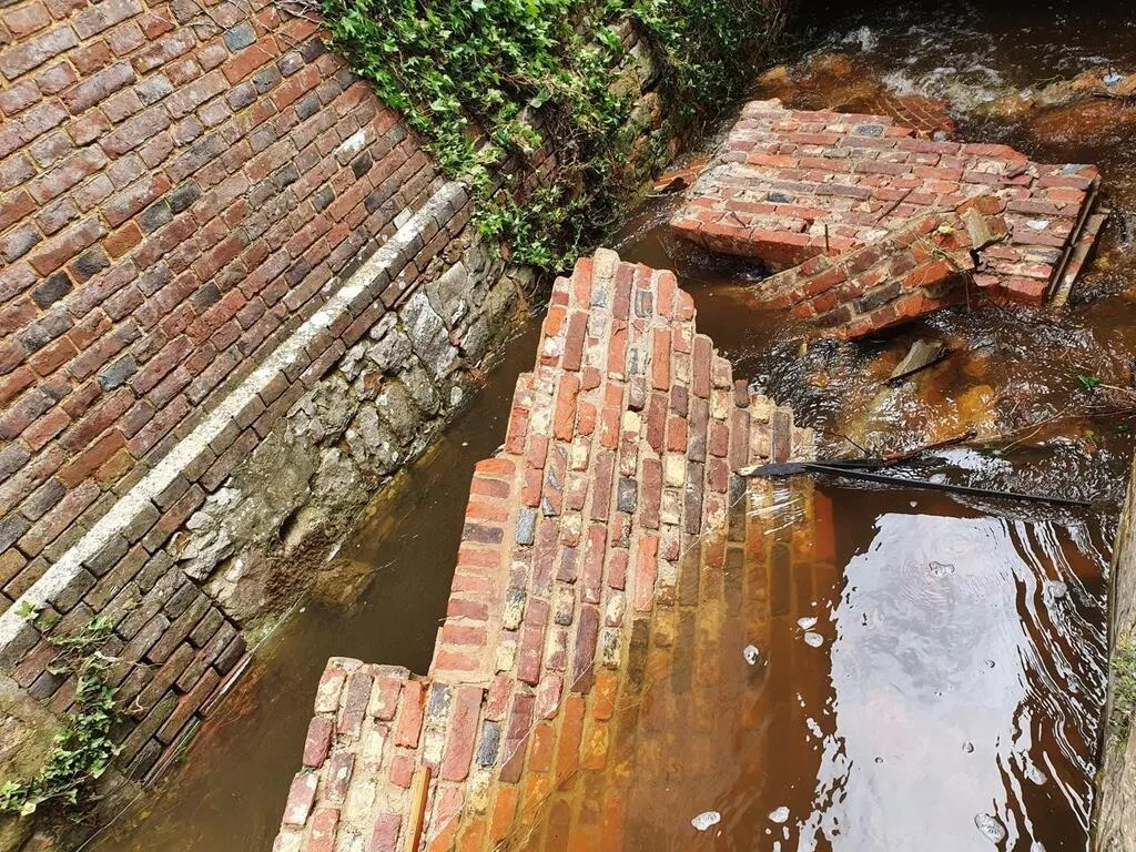 Une partie du mur, dans l’arrière-boutique de la quincaillerie, est tombée dans le cours d’eau qui passe derrière le commerce. Ouest-France