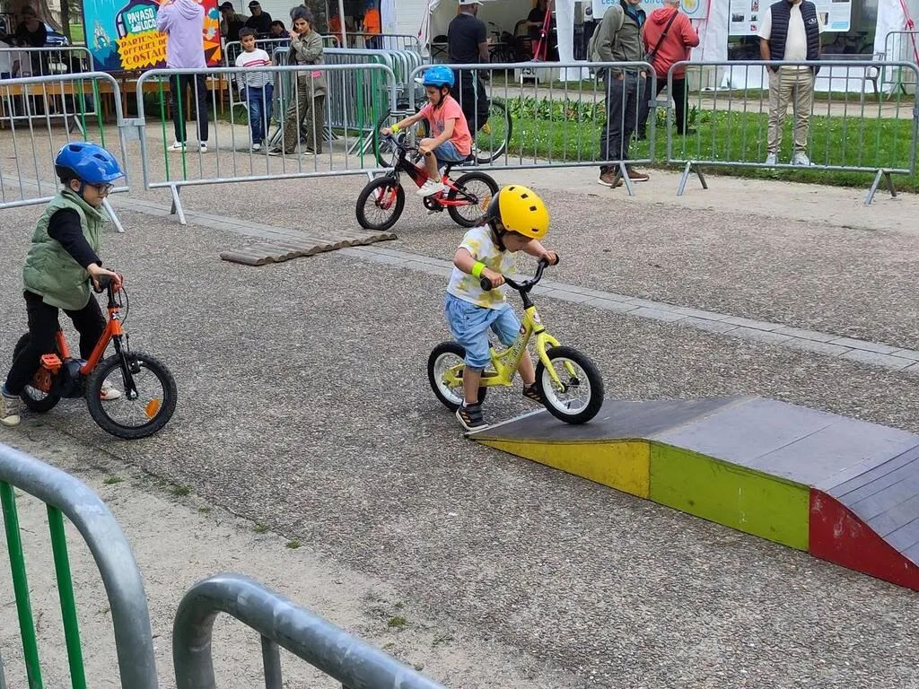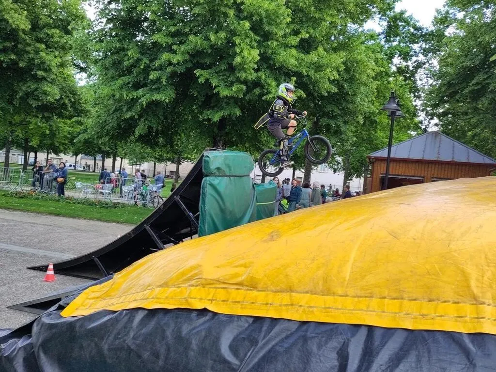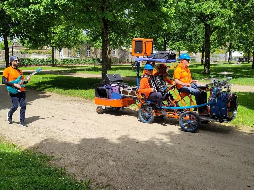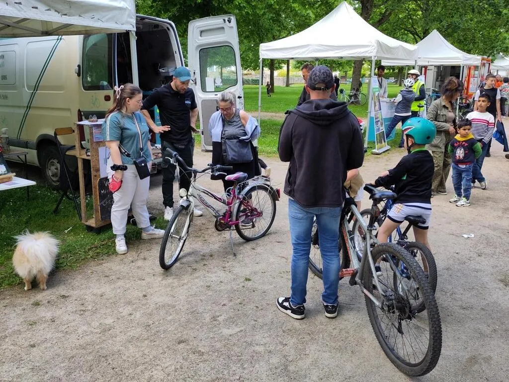 Quelques petites gouttes de pluie ne sauraient démoraliser les amateurs de mobilités douces qui organisent la fête du vélo, au parc de Promenades, samedi 18 mai 2024. L’ambiance est détendue et la musique est assurée par la compagnie des Playbobils avec leur rosalie.