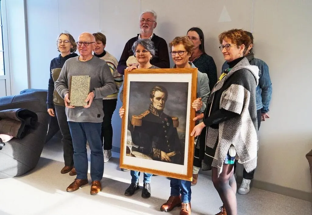 Accompagnés d’Évelyne Groussard-Hubert, maire déléguée, les membres bénévoles du pôle culturel qui préparent l’exposition. Au fond à gauche, Gérard Villeroy, historien. © Ouest-France