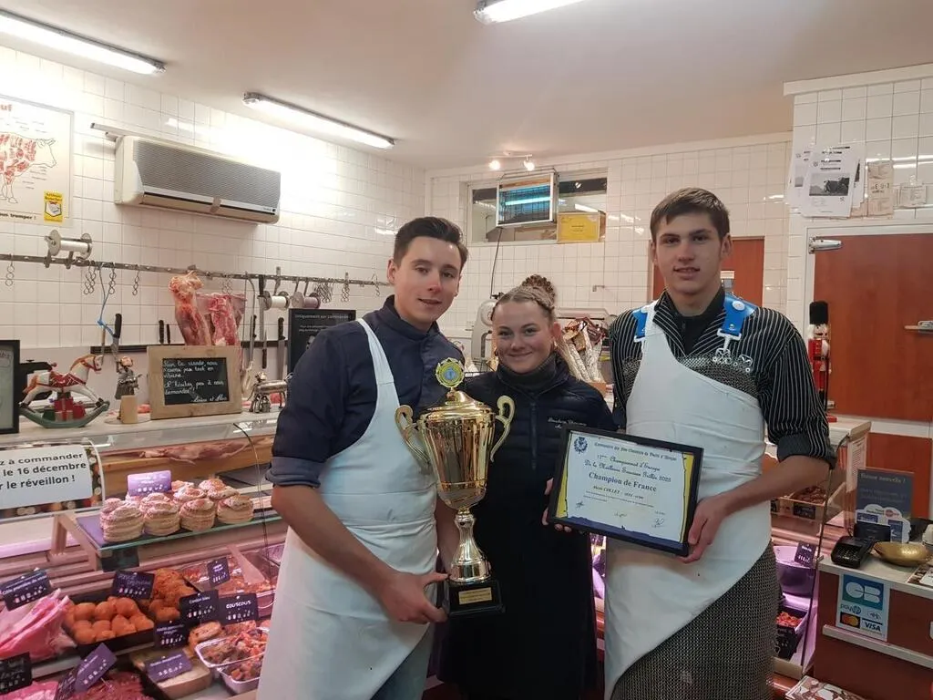 Alexis Collet (à gauche) et Lorène Perreaux sont les propriétaires de la boucherie des Halles à Sées (Orne), aux côtés de leur apprenti. © Ouest-France