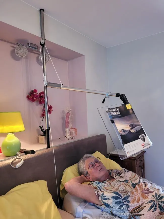 « Le liseur », une des dernières inventions de Pierre, à l’état de prototype actuellement, ici utilisé par Jacqueline, son épouse. Pierre a été plusieurs fois médaillé du Concours Lépine et lors du Salon international des inventions de Genève. © Ouest-France
