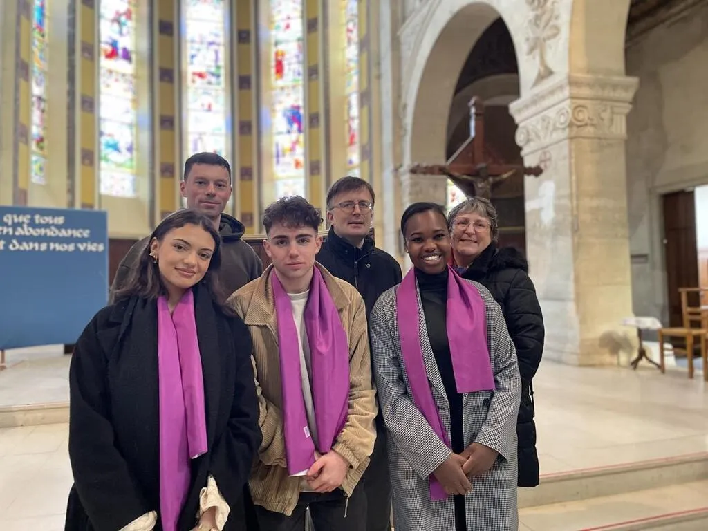 Au premier rang : Yasmine Diab, Tom Pingault et Anika Zadi vont se faire baptiser lors de la veillée pascale du samedi 30 mars 2024. Ils sont entourés au deuxième rang par l’abbé Denis Durand (au milieu) et les accompagnateurs de catéchumènes, Trystan Fauvel et Josette Bénis. © Ouest-France