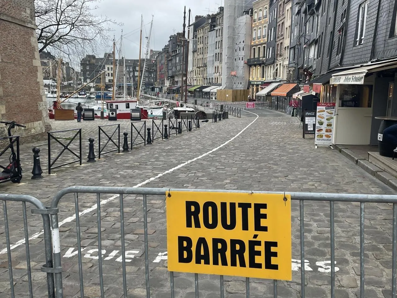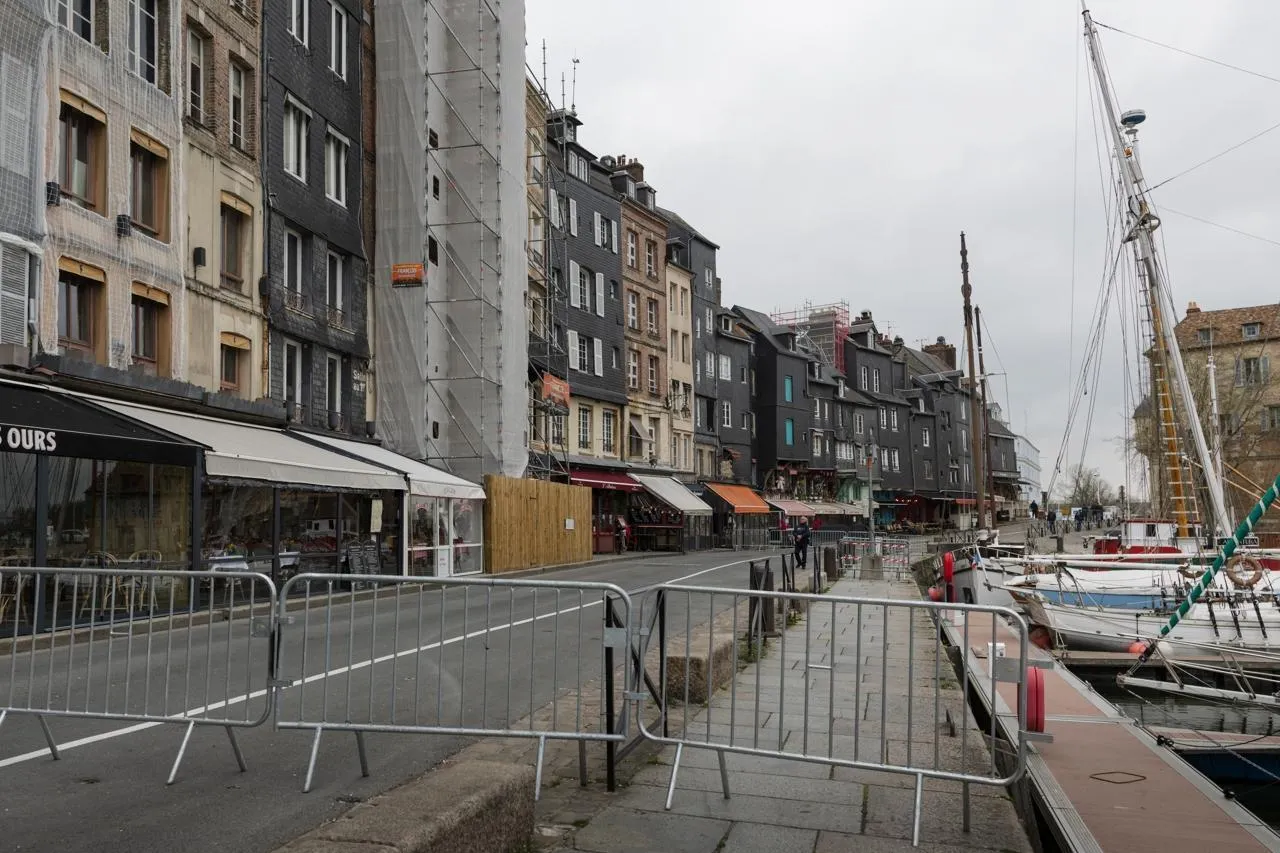 Le quai Sainte-Catherine, à Honfleur (Calvados), est désert, ce mercredi 1er avril 2026 dans l’après-midi, il a été fermé à la circulation et aux piétons. © Ouest-France