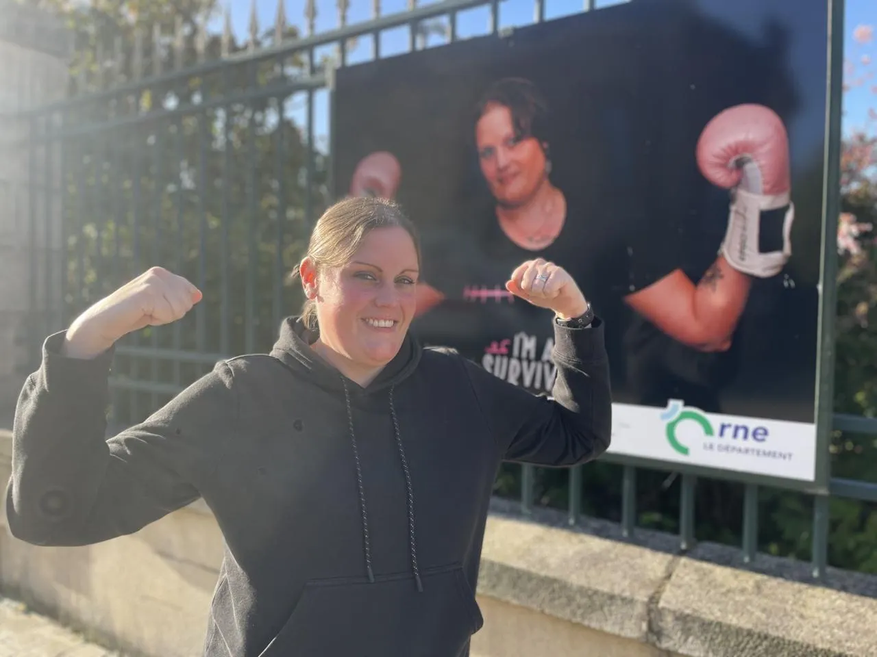Jennifer Derouet a participé à un projet photo exposé sur les grilles du conseil départemental de l’Orne, dans le cadre d’Octobre rose. © Ouest-France