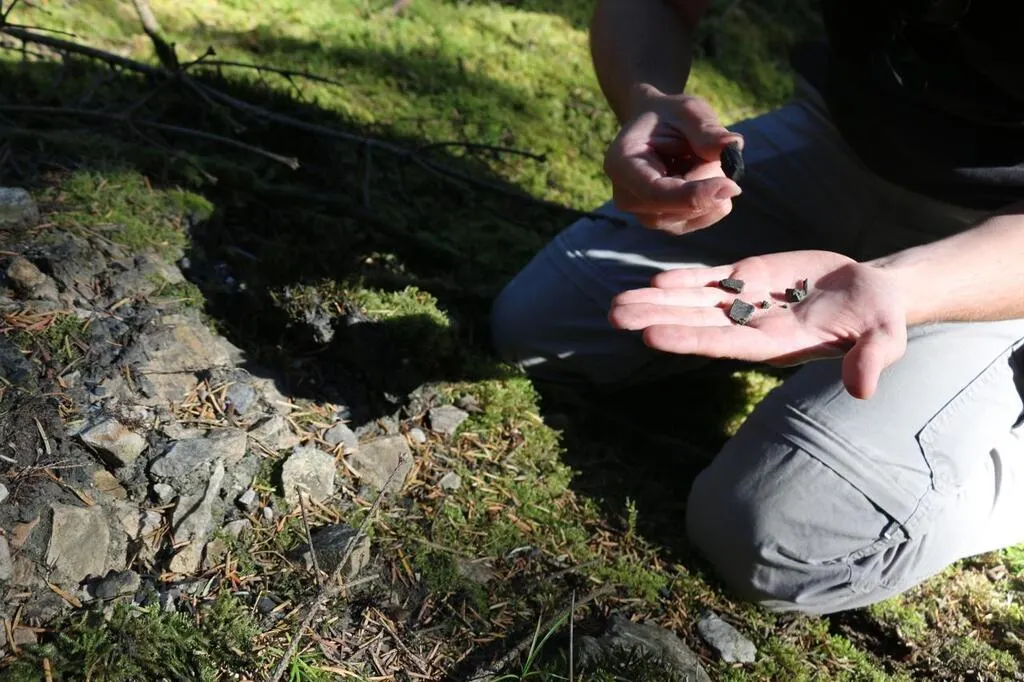 Après seulement quelques minutes de marche apparaît la première plateforme de charbonnage. Difficile à repérer pour un œil non avisé, elle forme une alvéole au sol. Il suffit souvent de gratter un peu pour dénicher des restes de charbon, parfois de plusieurs centimètres de diamètre.  Le charbon alimentait les nombreuses forges alentour. Nous avons recensé 9 500 plateformes de charbonnage dans cette forêt, ce qui en fait sans doute l’endroit où on en trouve le plus en France, voire en Europe »,