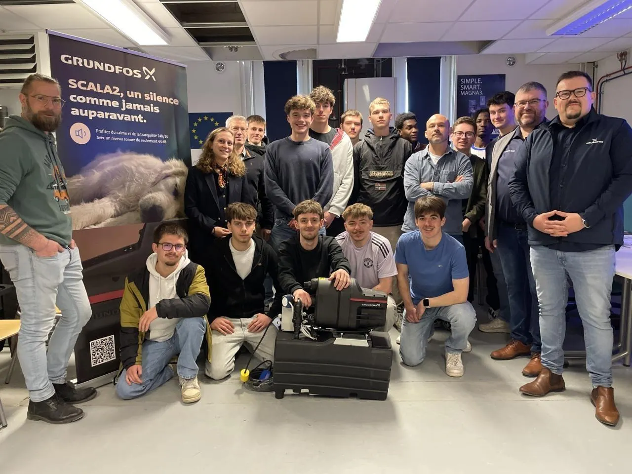 Lors de la remise de matériel aux élèves du lycée Gabriel à Argentan (Orne) par l’entreprise Grundfos, mardi midi. © Ouest-France