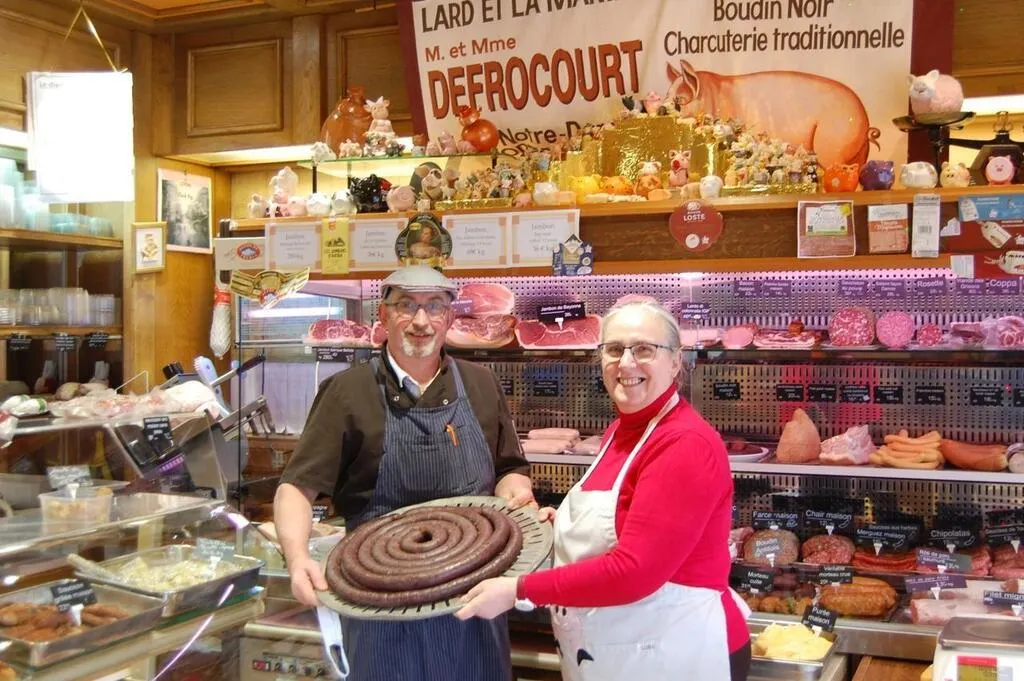 Xavier et Patricia Defrocourt, installés depuis vingt ans au 3, rue du Colonel-Guérin, participent à la Foire au boudin à emporter et auront un stand devant leur magasin. © Ouest-France