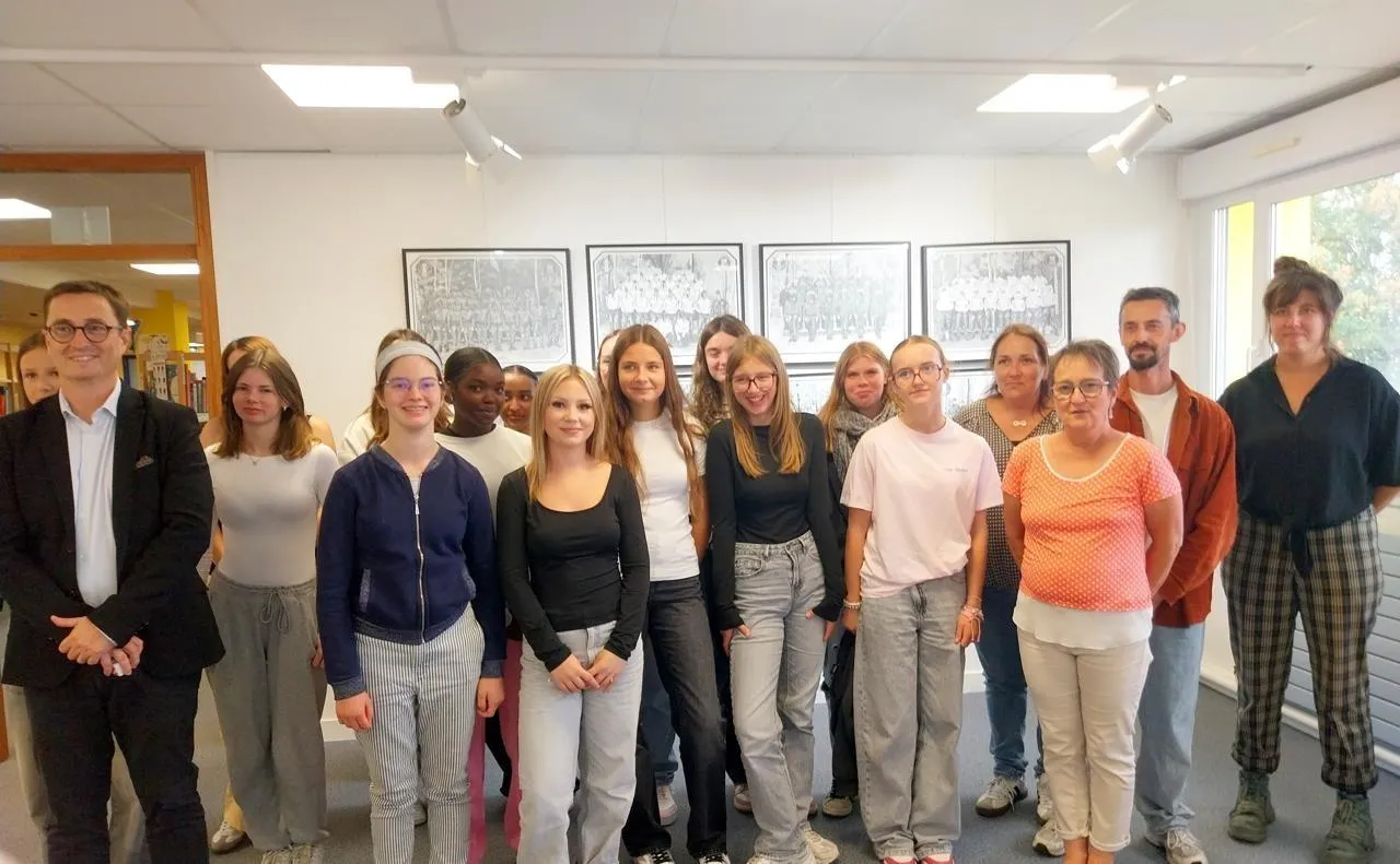 Les élèves de seconde Accompagnement soins et services à la personne du lycée professionnel Flora-Tristan de La Ferté-Macé (Orne) avec, à gauche, Stéphane Garnung, proviseur et, à droite, Mélissa Mérinos, artiste et photographe, Aurélien Manier, professeur documentaliste et deux professeures. © Ouest-France