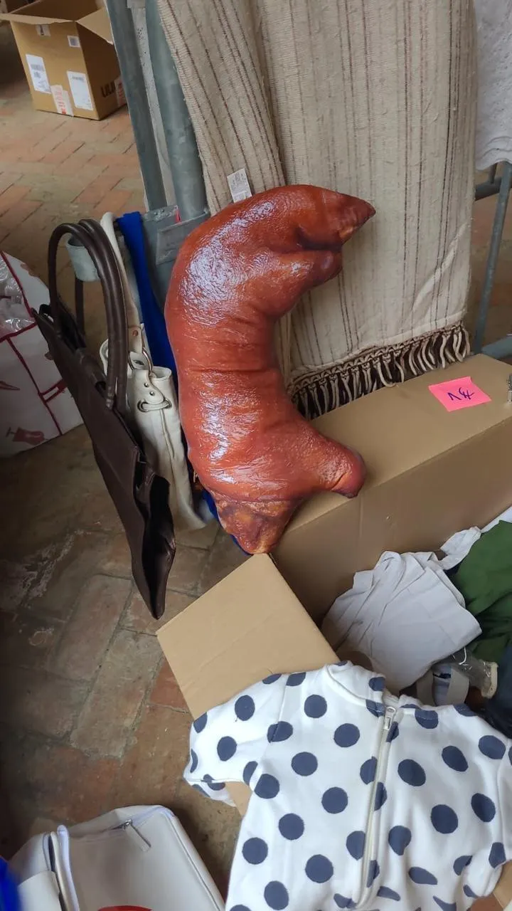 Ce coussin en forme de pied de cochon a trouvé acheteur dès 10 h, mercredi 1er mai 2024, au traditionnel vide-greniers de Lancrel. © DR