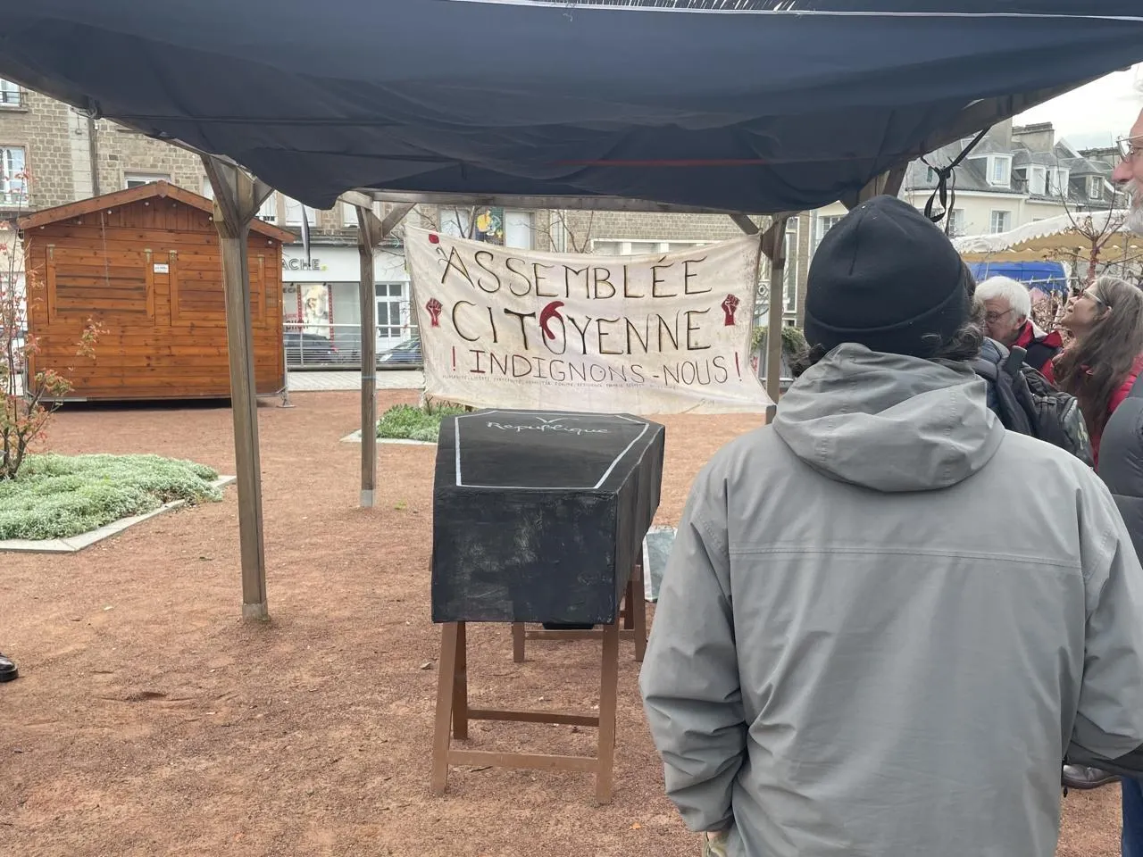 Une assemblée citoyenne populaire se réunit chaque samedi au marché de Flers, dans l’Orne. Les citoyens issus du mouvement « Bloquons tout » ont confectionné un cercueil de la Ve République, ce samedi 15 novembre 2025.