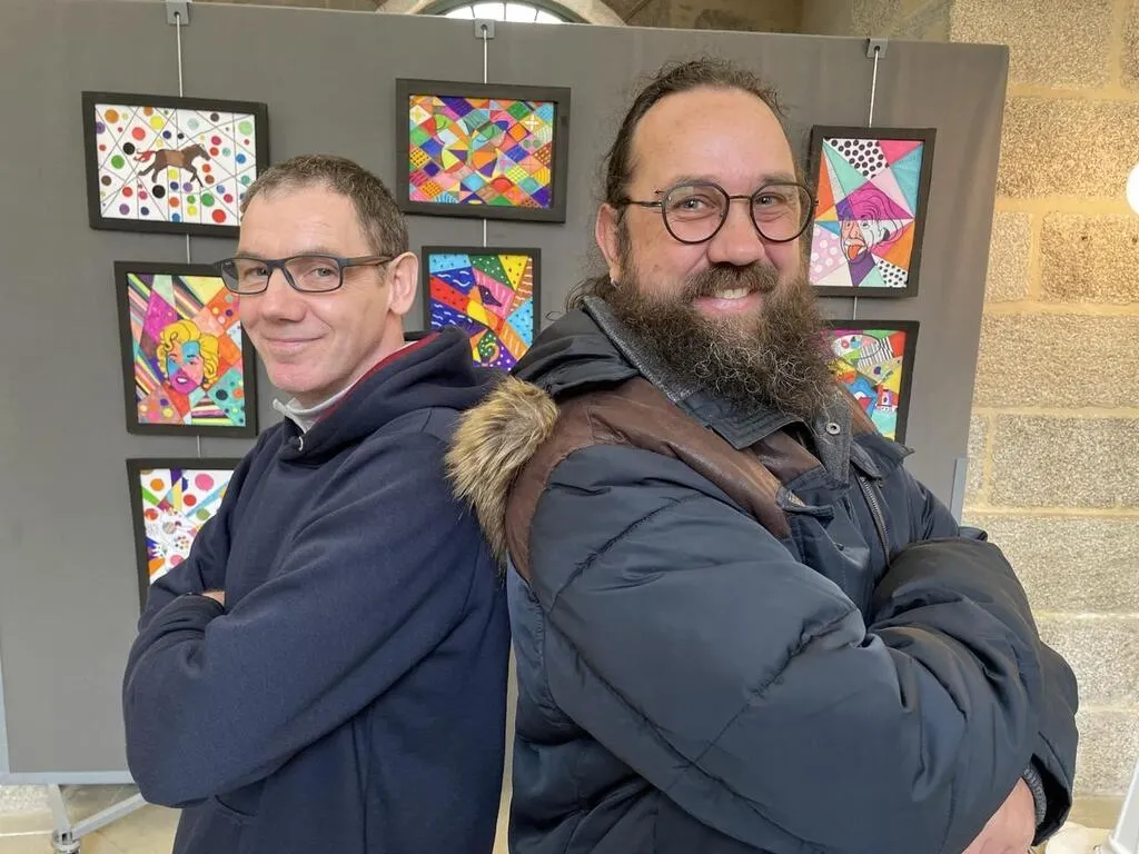 Suivis au centre psychothérapique de l’Orne (CPO), Sébastien et Olivier font partie de la cinquantaine de patients dont les Å“uvres sont exposés à la halle au Blé, dans le centre-ville d’Alençon, du 16 au 18 avril 2024. © Ouest-France