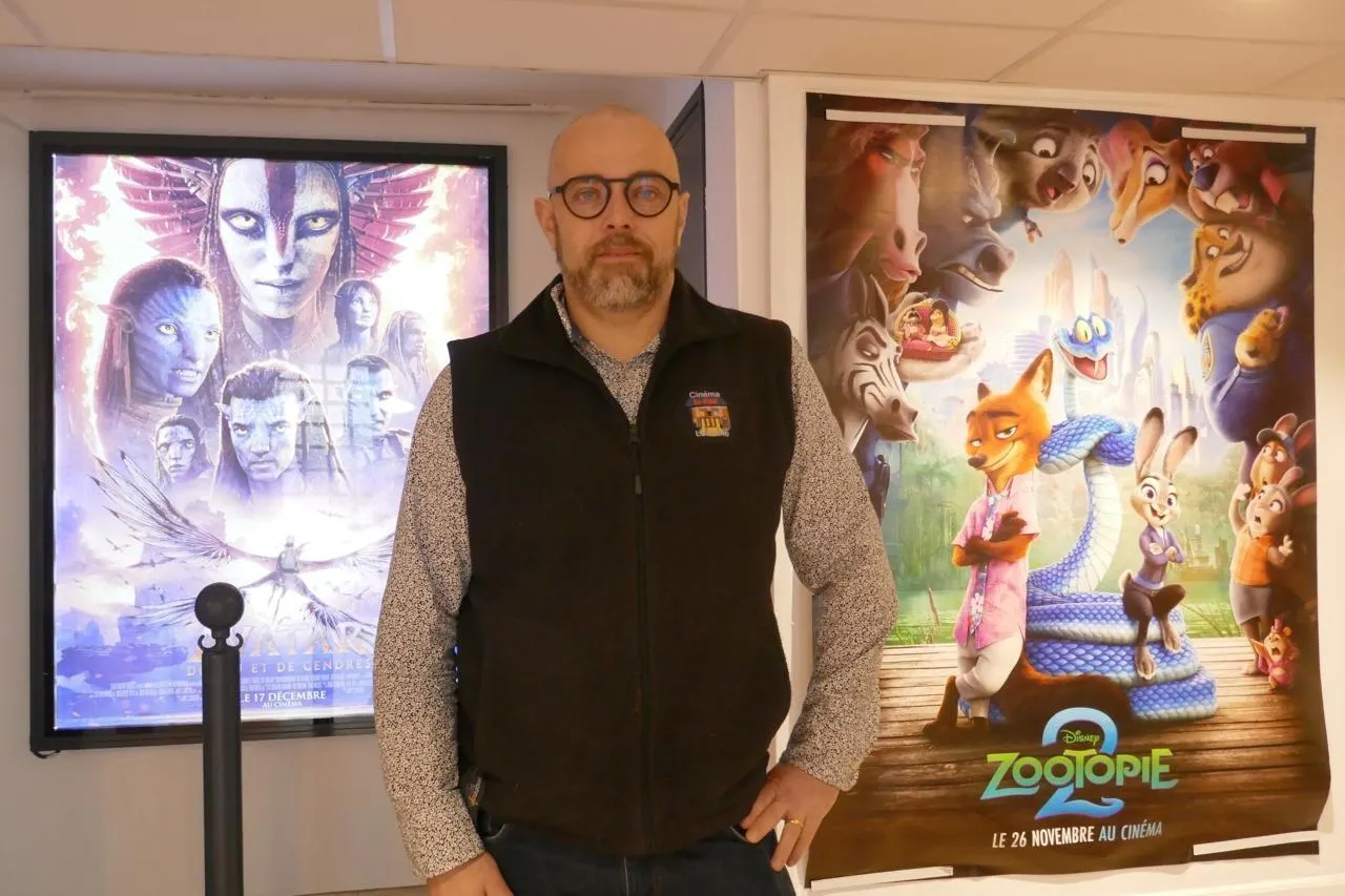 Emmanuel Le Roux, directeur du cinéma Le Club, entre les affiches d’Avatar et Zootopie 2, les films les plus vus en 2025. © Ouest-France