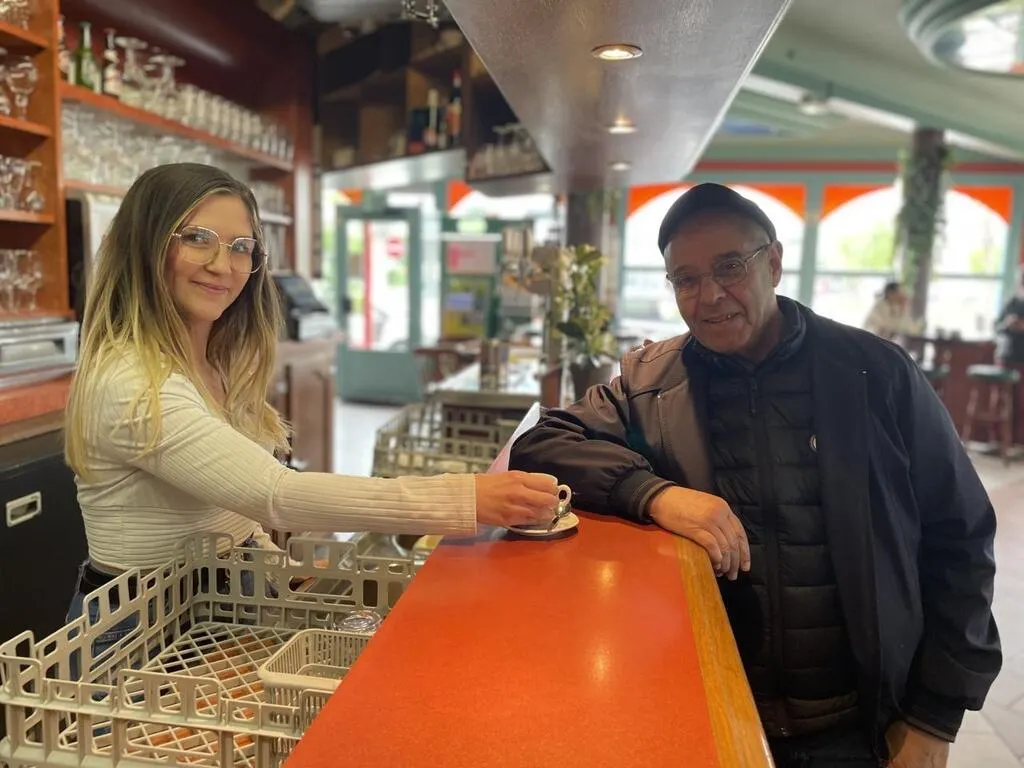 Fanny Boudier, 26 ans, est l’une des deux salariés de l’établissement. Elle retrouve avec grand plaisir la clientèle. Ici avec Ben, un habitué du lieu. © Ouest-France