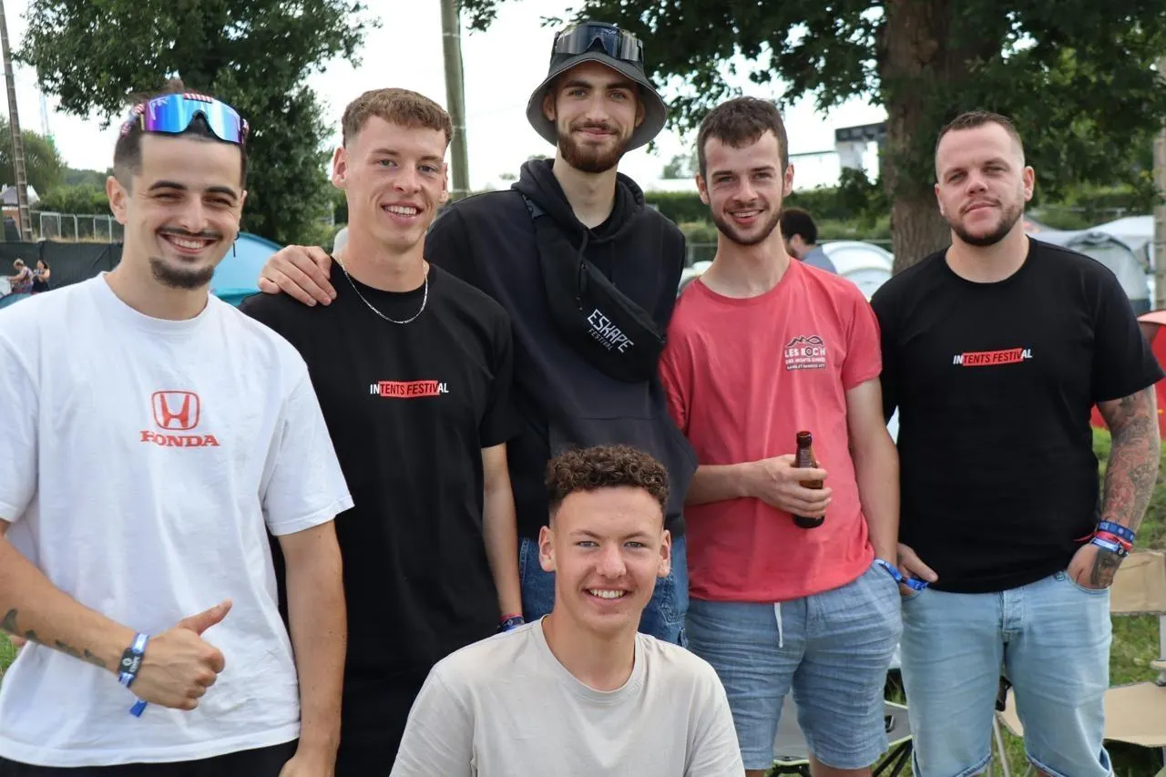 Sam Berthelot, Maël Pichon, Nathan Moro, Gwen Pichon, Steven Heurtel et Gwen Pichon (accroupi) sont campeurs pour l’Eskape festival 2025. © Ouest-France