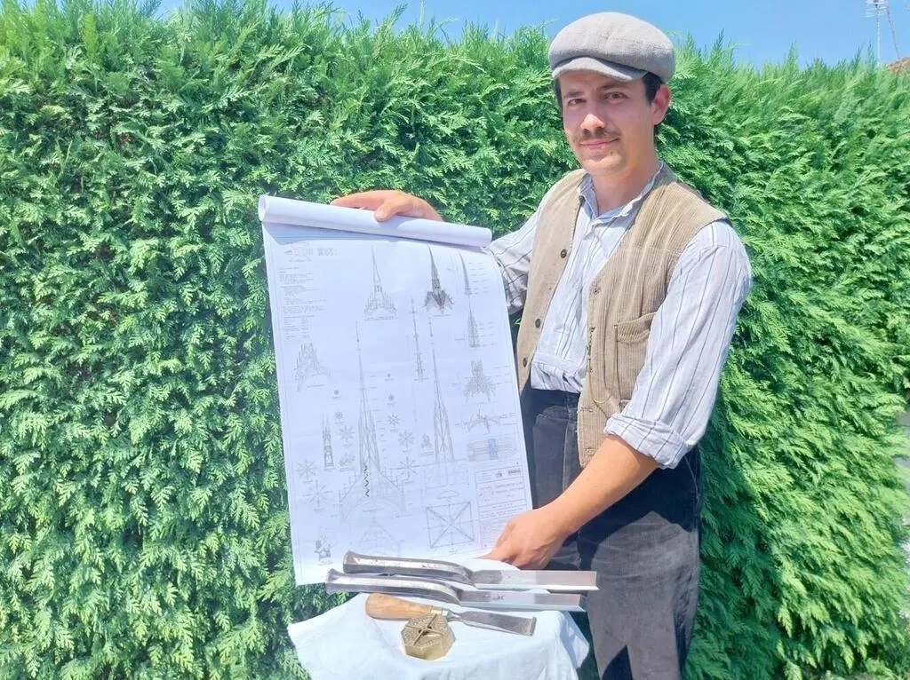 Natan Chevrier, jeune du Bocage Ornais, a participé à la reconstruction de la flèche de Notre Dame de Paris. Il montre le plan de rénovation de la flèche et quelques outils qu’il a utilisé. © Ouest-France