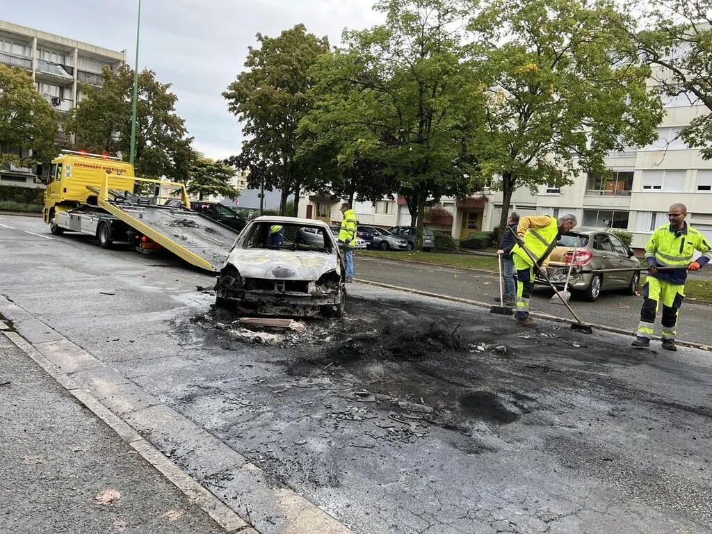 Ce mercredi matin, les carcasses des vingt-quatre véhicules incendiés sont retirées de la chaussée. © Ouest-France