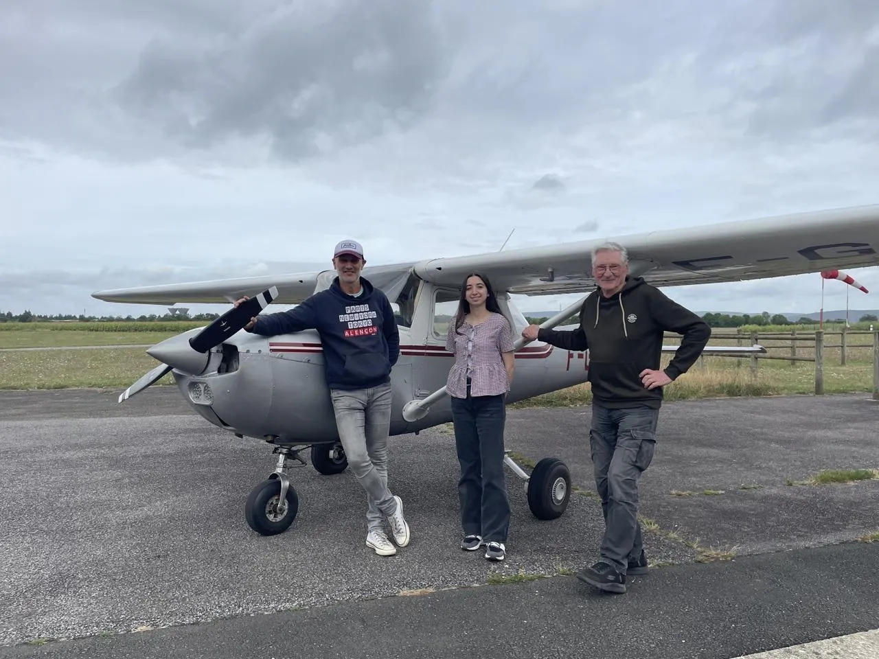 Gabriel Prouveur et Pierre Monnier, bénévoles de l’aéroclub, entourent leur élève Nisa Topkara, tout juste diplômée du Brevet d’initiation aéronautique (BIA). © Ouest-France