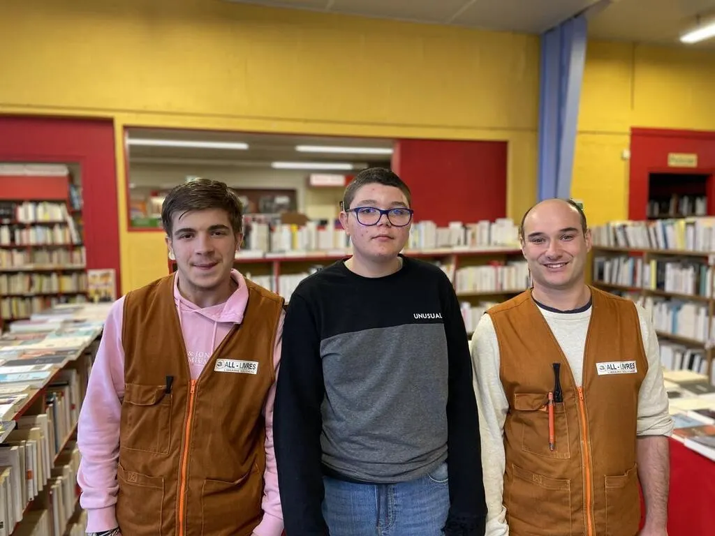 Lucas Girard, 17 ans, Evan Berel 14 ans, deux stagiaires à All Livres à Flers, en situation de handicap ont travaillé avec Gaëtan Bermond, salarié depuis onze ans dans la libraire. © Ouest-France