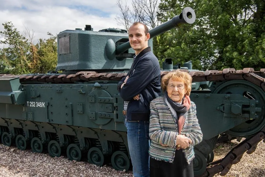 Annette Lajon et son petit-fils Thomas Lajon devant un char exposé sur la Cote 112 (en anglais : Hill 112), située à environ 10 km au sud-ouest de Caen (Calvados). Les combats entre troupes allemandes et anglo-canadiennes y durèrent plus de sept semaines, de juin à août 1944. © Martin ROCHE, Ouest-France