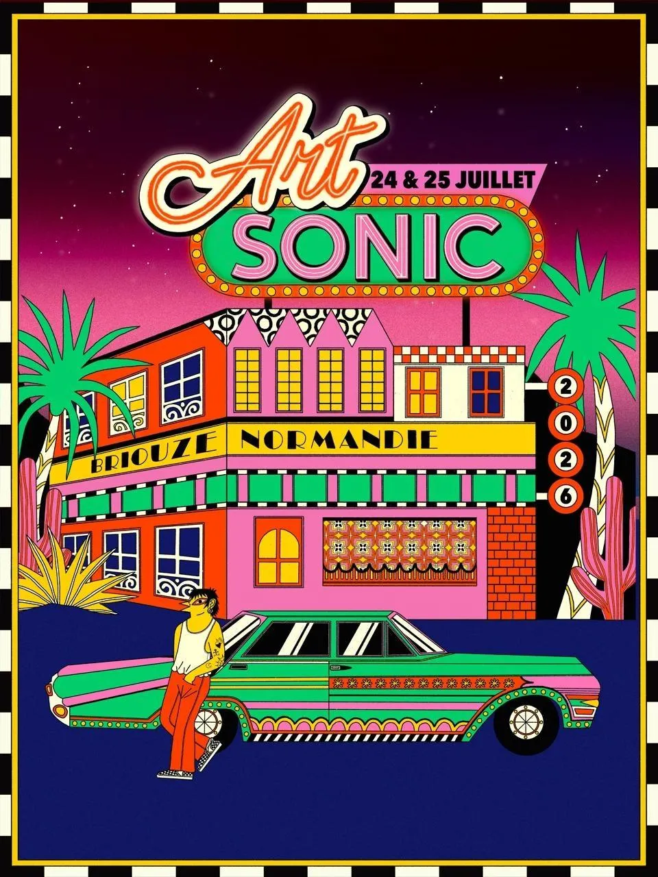 Pour la deuxième année consécutive, l’artiste Petrouchkaka a dessiné l’affiche et imaginé le visuel du festival Art Sonic de Briouze, dans l’Orne, qui aura lieu les 24 et 25 juillet 2026, avec des influences tirées de la Californie, de la pop-culture et de la mythologie.
