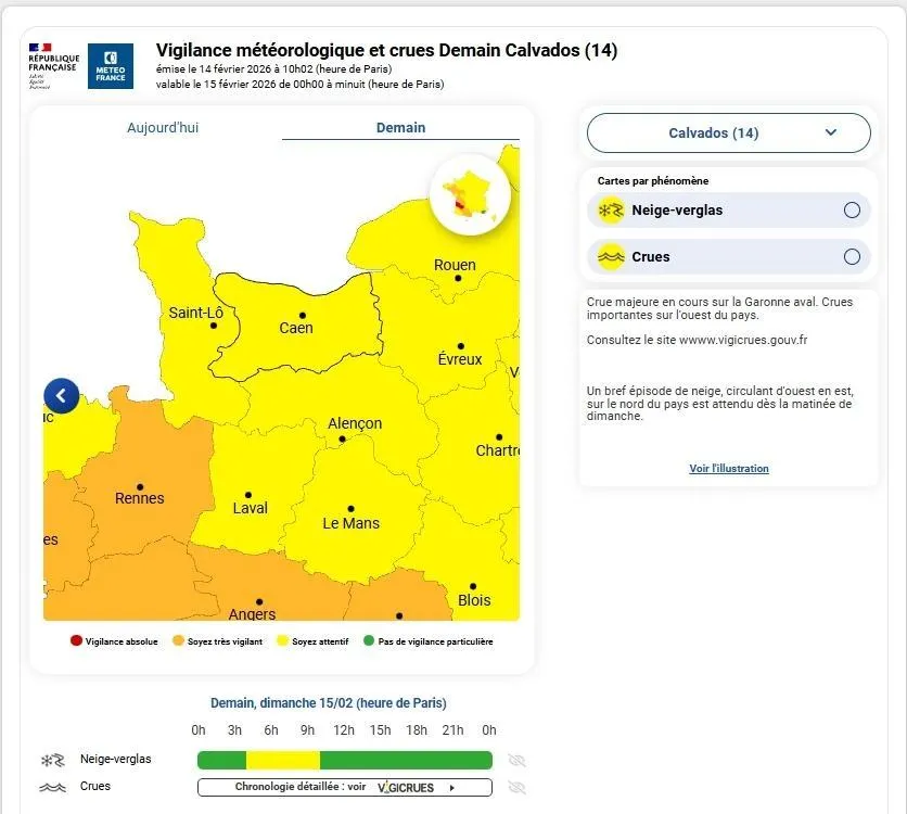 La Normandie est placée en vigilance jaune neige-verglas par Météo France, sauf le département de la Manche qui est en vigilance jaune crues, dans son bulletin de prévisions de ce samedi 14 février 2026 au matin. Capture d’écran Météo France