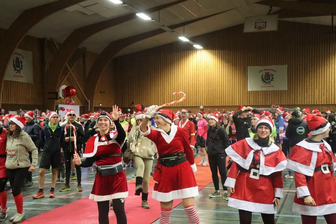 Avant de prendre le départ, dans une ambiance festive, où les costumes rouges et blancs étaient de sorties, les participants se sont échauffés sur la traditionnelle chanson de Noël de Mariah Carey All I want for Christmas is you . Au top départ les lampes frontales se sont allumés et les mollets se sont activés.