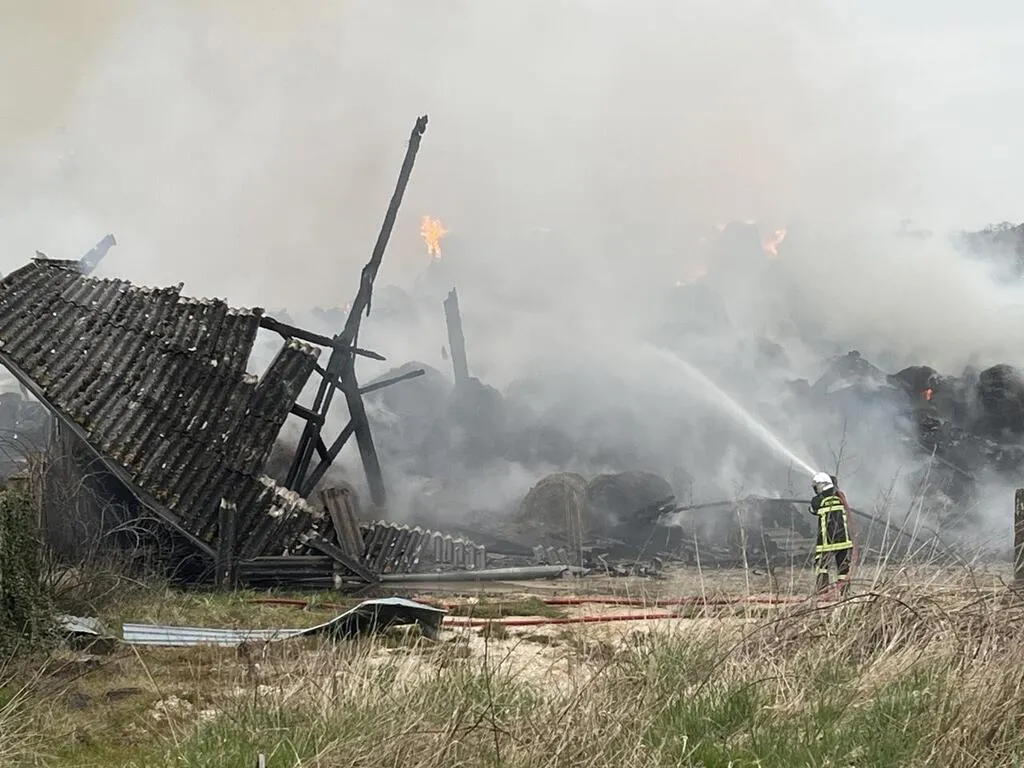 L’incendie s’est déclaré dans un bâtiment agricole de 500 m2 qui contenait 240 tonnes de foin, dans la nuit du 20 au 21 mars 2025, à La Bellière (Orne). © Ouest-France