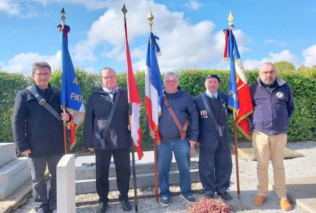 Porte-drapeaux et membres d’associations de combattants devant la tombe du soldat américain Davidson, à Couterne. De gauche à droite : Cédric Moulin, Chantal Miclard, Martial Serais, Claude Lefèvre et Didier Miclard © Ouest-France
