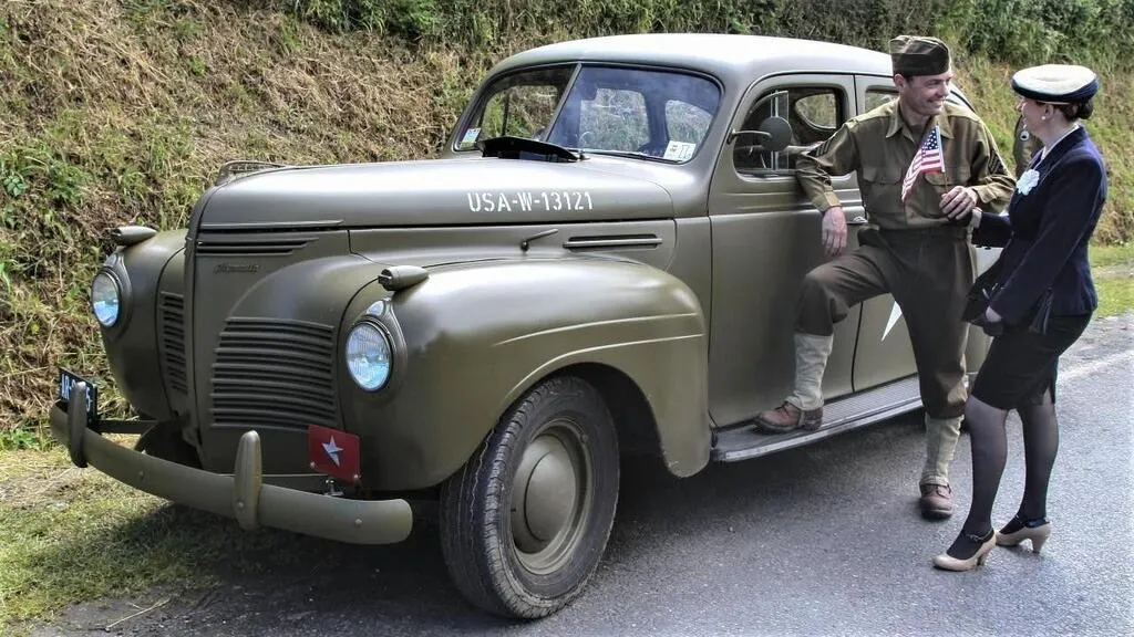 Devant une Plymouth P10 US, Philippe et Sylvie Leforestier en tenues d’époque, lors du 75e anniversaire du Débarquement de Normandie. Archives Ouest-France / Stéphane Chotard