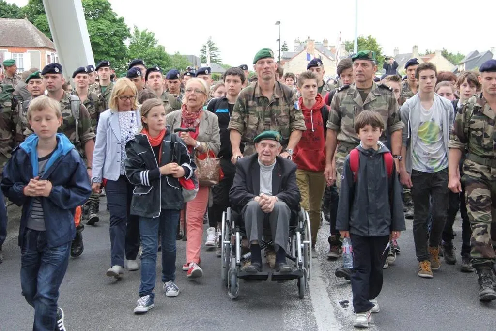 En 2014, 250 fusiliers marins et 450 écoliers et collégiens de la Côte de Nacre avaient marché quinze kilomètres sur les pas du commando Kieffer. Le vétéran Léon Gautier était avec eux. Archives Ouest-France