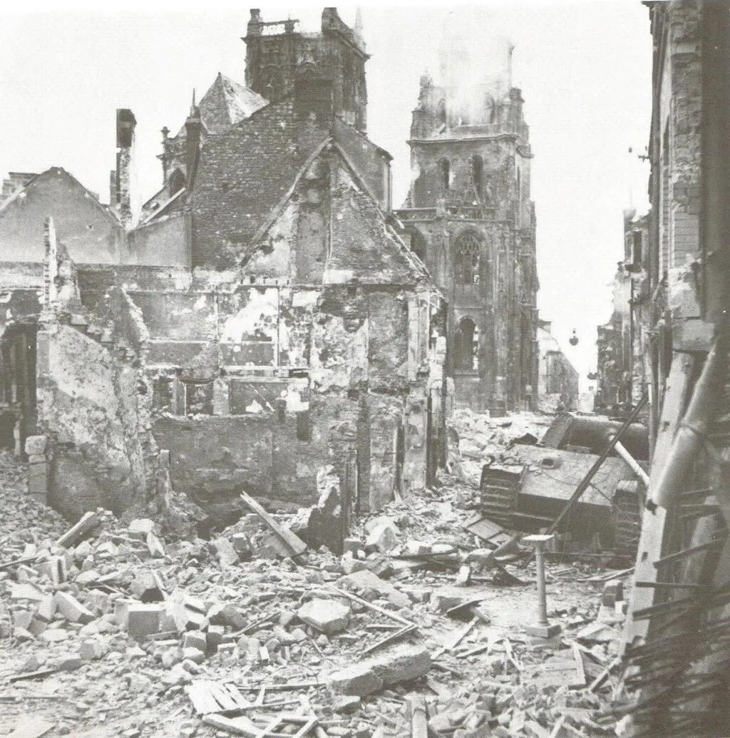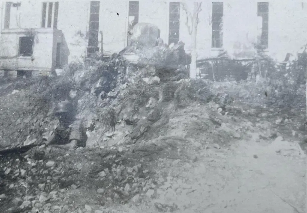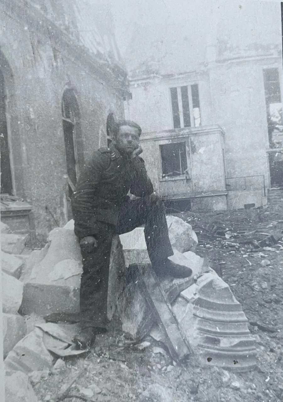 Rare photo d’un soldat allemand (à gauche) dans un cratère de la cour intérieure de l’Institution Jeanne d’Arc, rue de la Vicomté, bombardée le 23 juin 1944. Au fond, les murs de la chapelle, qui abrite désormais… le cinéma d’Argentan. © Collection François Boscher