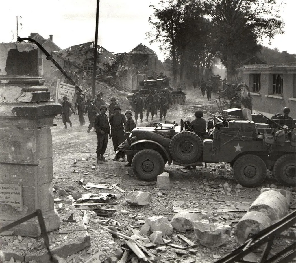 Photo prise le 21 août 1944, au carrefour des Trois-Croix (la colonne, à gauche). Au fond, les Alliés arrivent de la rue des Petits-Fossés. Le véhicule à droite semble venir de la route de Trun, voie par laquelle les Allemands retraitent. © IWM Archives anglaises