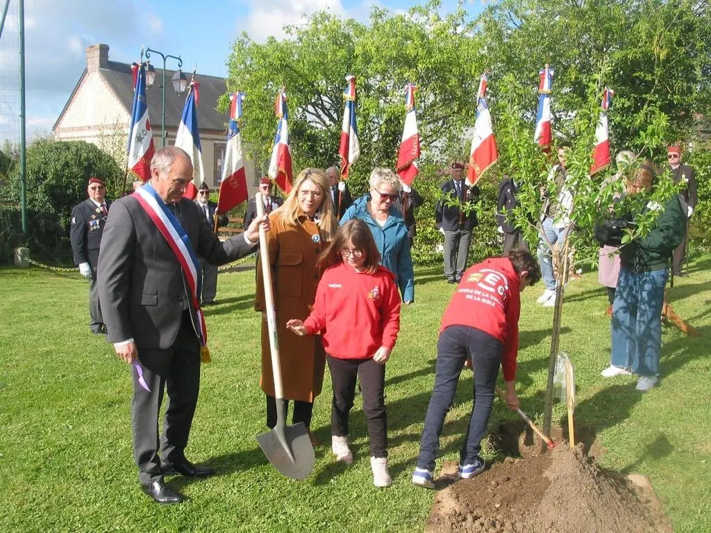 80e D-Day. Un cerisier de la liberté planté à Échauffour, en hommage à l’aviateur Arnold Pederson... |