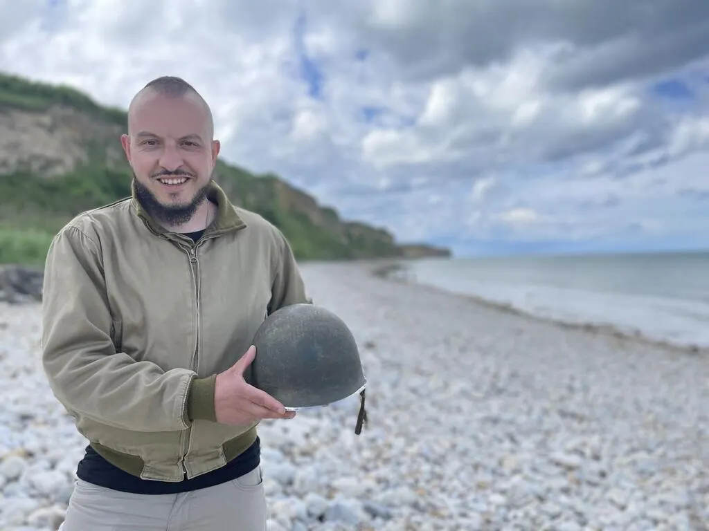 Julien Tanguy est Normand et passionné de militaria depuis l’enfance. Il est ici sur la page d’Omaha Beach, avec en main un casque authentique de la 29e division d’infanterie américaine, qu’il a déniché et qui est aujourd’hui exposé au musée D-Day Omaha, à Vierville-sur-Mer (Calvados). © Ouest-France