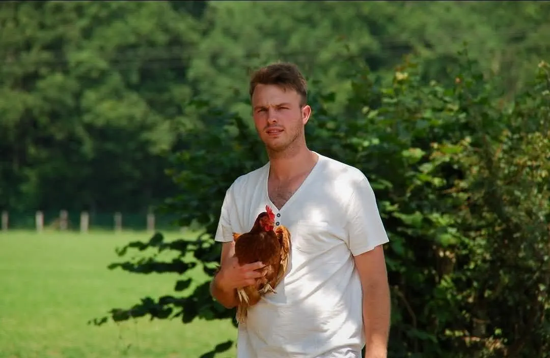 Arthur Fleury, 27 ans, avec ses poules en plein air à Joué-du-Plain. © Archives Arthur Fleury