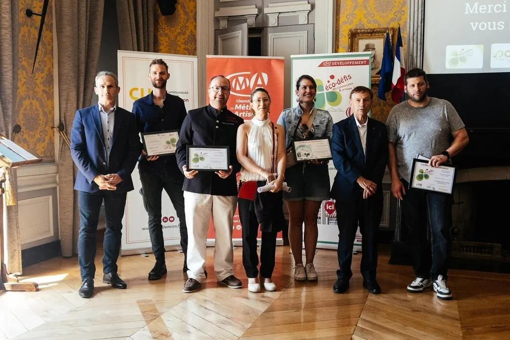 Plusieurs artisans de la CUA ont reçu des mains de Joaquim Pueyo et de Bruno Balloche le label Éco-défis. © Ouest-France