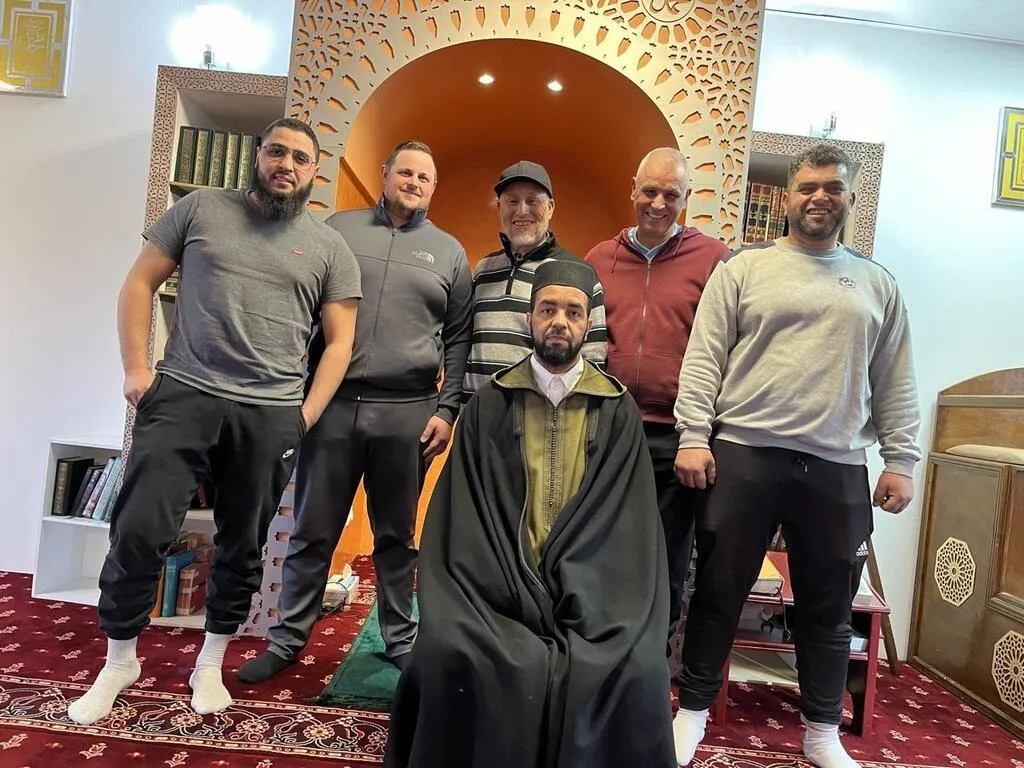 De gauche à droite : Mouhaine Oulhaj, président adjoint ; Florian Pitel, secrétaire adjoint ; Abdelghami Nfaoui, président ; Hamid Bakhchouch, trésorier ; Aabid Bouzagri, adhérent. Au premier plan, l’imam Bousselham El Hbichy. © Ouest-France