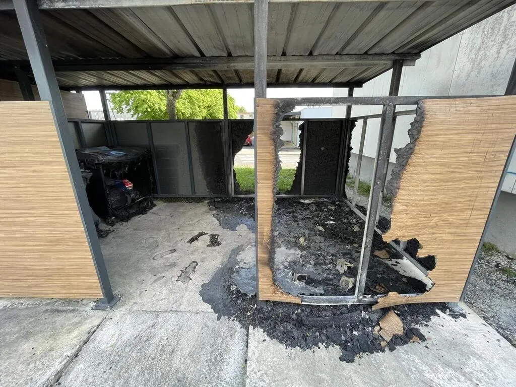 Des bacs roulants et un abri de poubelles ont été incendiés, place du Point-d’Argentan, lundi 13 mai 2024. © Ouest-France