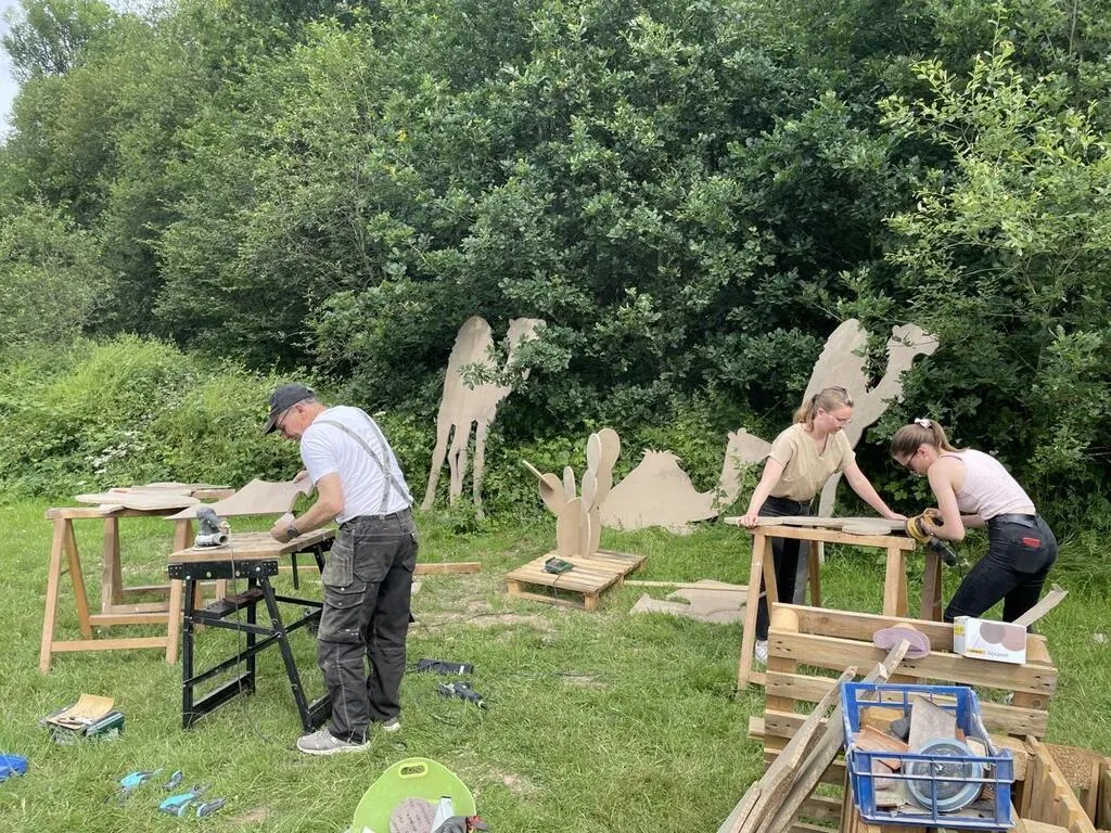 François Lesage, bénévole au CPIE, Maëlys Lebouteiller, service civique et Océane Jan, stagiaire, préparent le décor désertique devant la maison du Paysage à Bréel, dans l’Orne. © Ouest-France