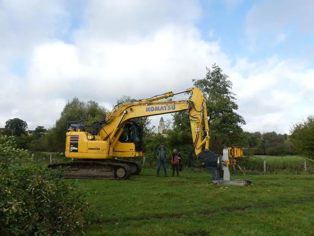 L’engin de 27 tonnes est équipé de chenilles pour ne pas abîmer les sols. Son huile est bio pour éviter de polluer la rivière s’il en tombe dans l’eau.